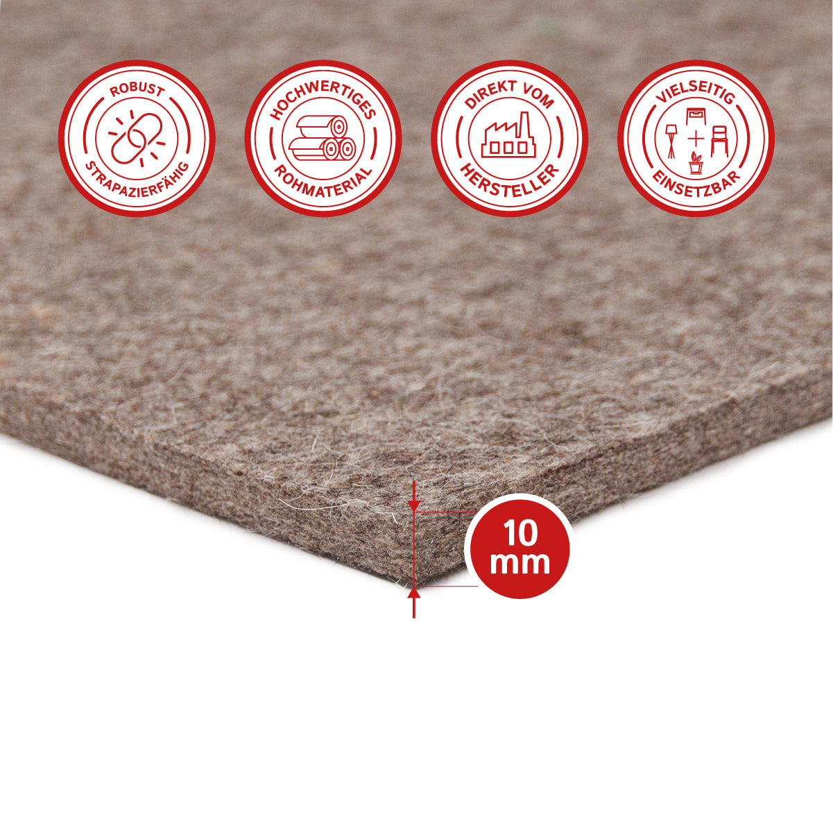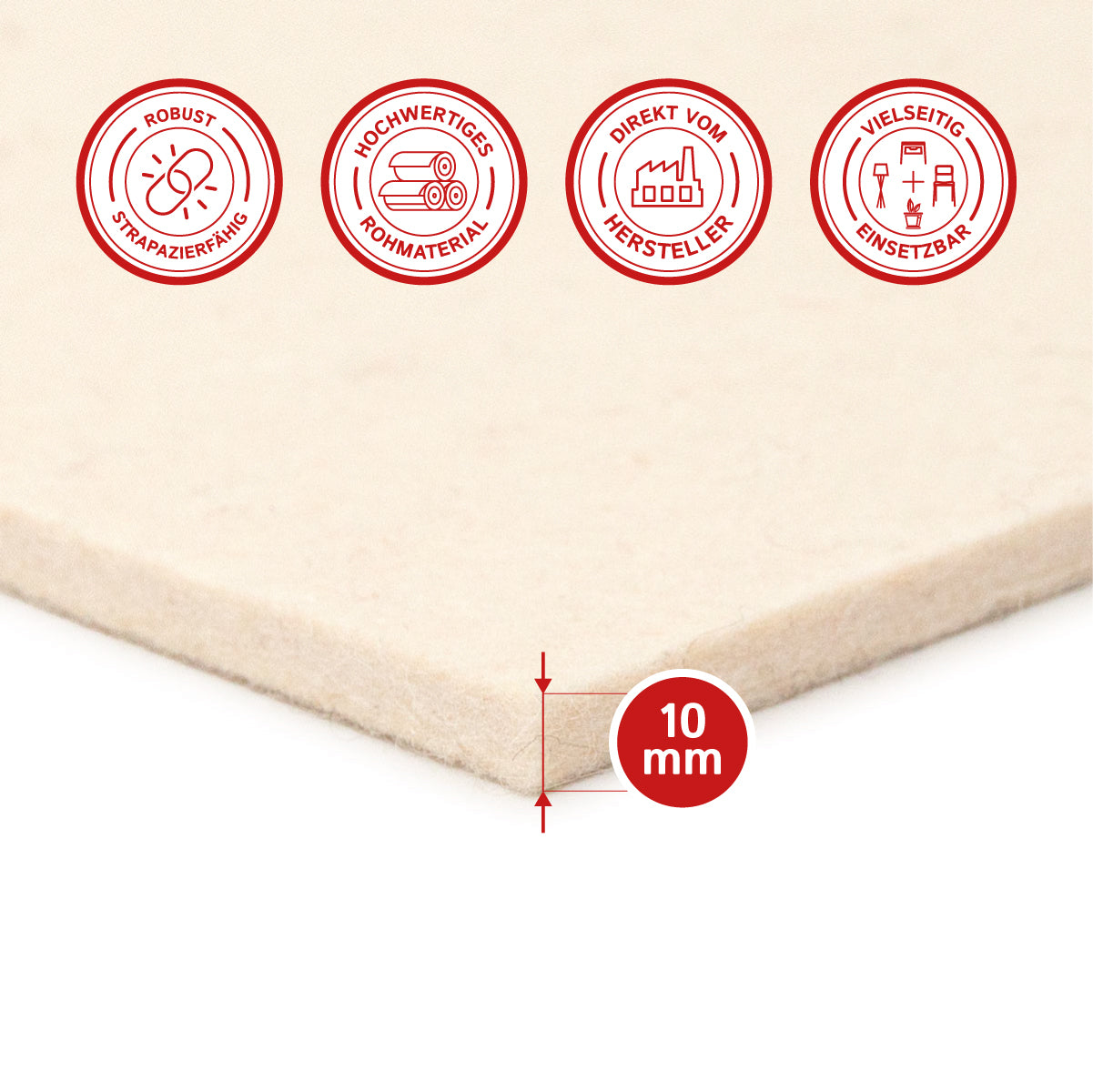 Im Gegensatz zu unseren dünneren Filzplatten eignet sich unsere 10mm Filzplatte besonders für Anwendungen, bei denen zusätzliche Isolierungseigenschaften gefragt sind, wie z.B. bei Heizungs- und Klimaanlagen oder in der Bauindustrie. Unsere Filzplatte bietet auch hervorragende Schalldämmung und Vibrationsdämpfung, was sie ideal für Anwendungen macht, bei denen eine hohe Präzision und Genauigkeit erforderlich sind.