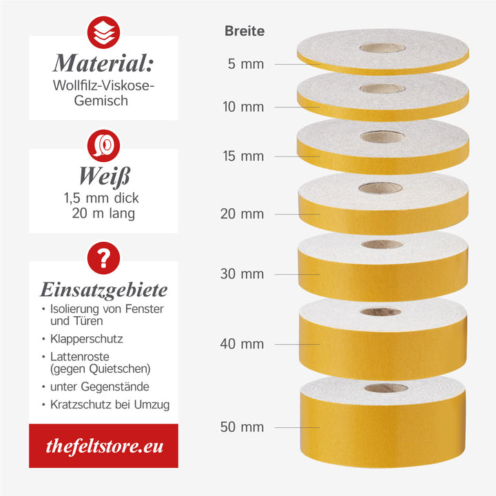 Alle Varianten des Filzbandes haben eine Dicke von ca. 1,5 mm und eine Länge von 20 Metern.