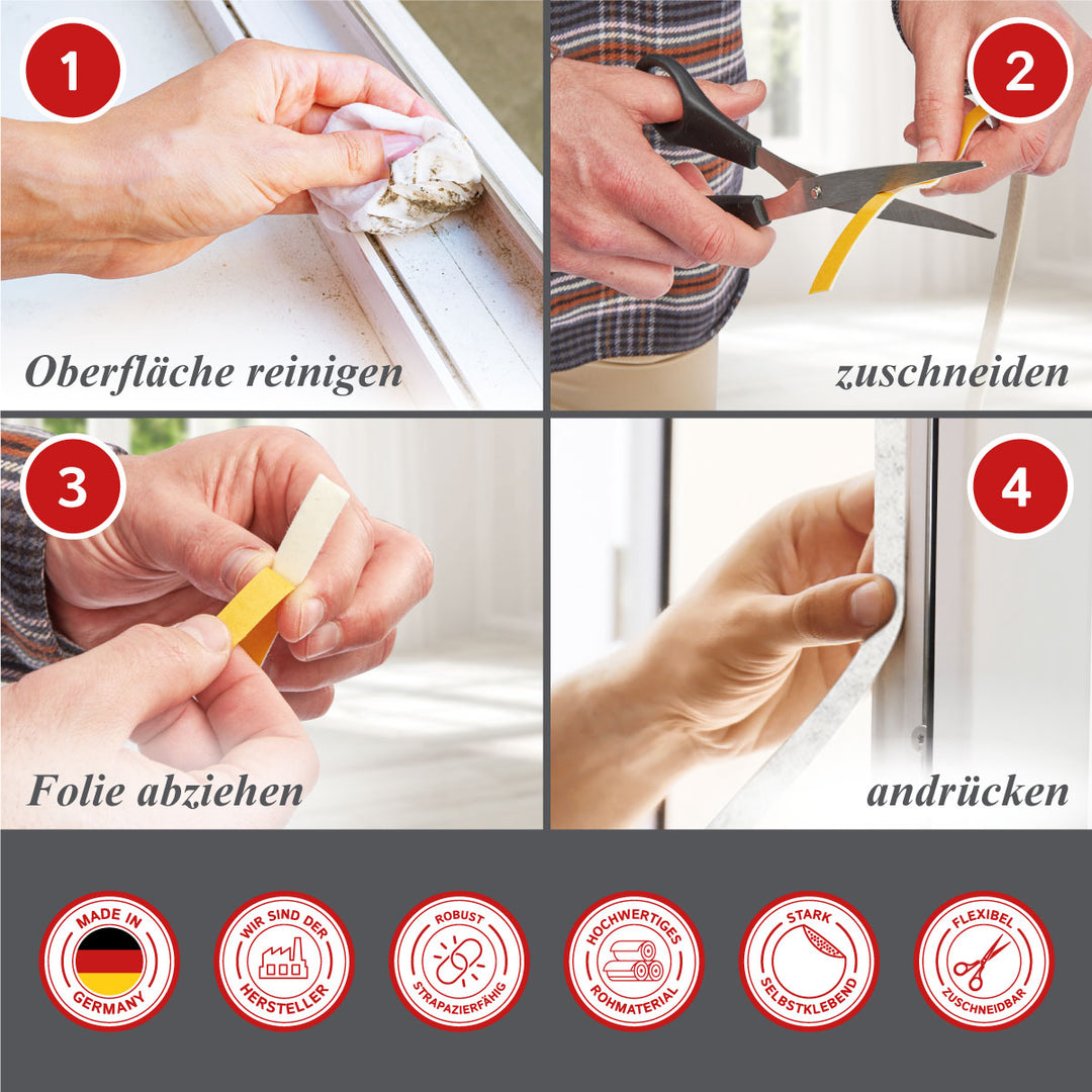 Unser Filzband ist von hoher Qualität Made in Germany. Mit Hilfe der selbstklebenden Seite können Sie es leicht an Wänden, Tür- und Fensterrahmen und anderen Gegenständen befestigen.