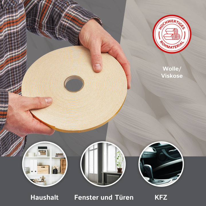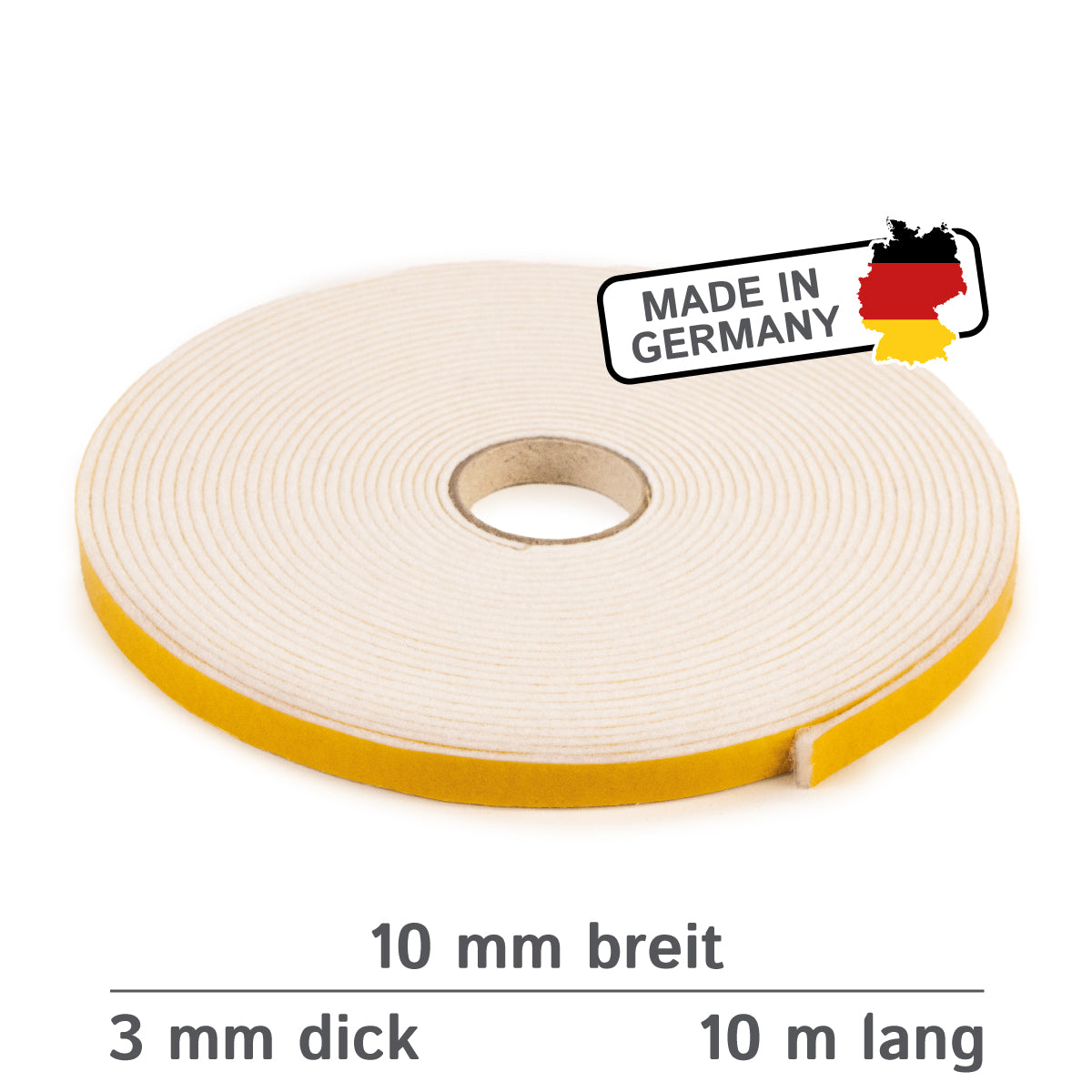 Ruban de feutre autocollant 10 mm de large, 3 mm d'épaisseur, 10 m de long, blanc, bande de feutre polyvalente - idéale comme ruban d'étanchéité ou comme protection anti-vibrations